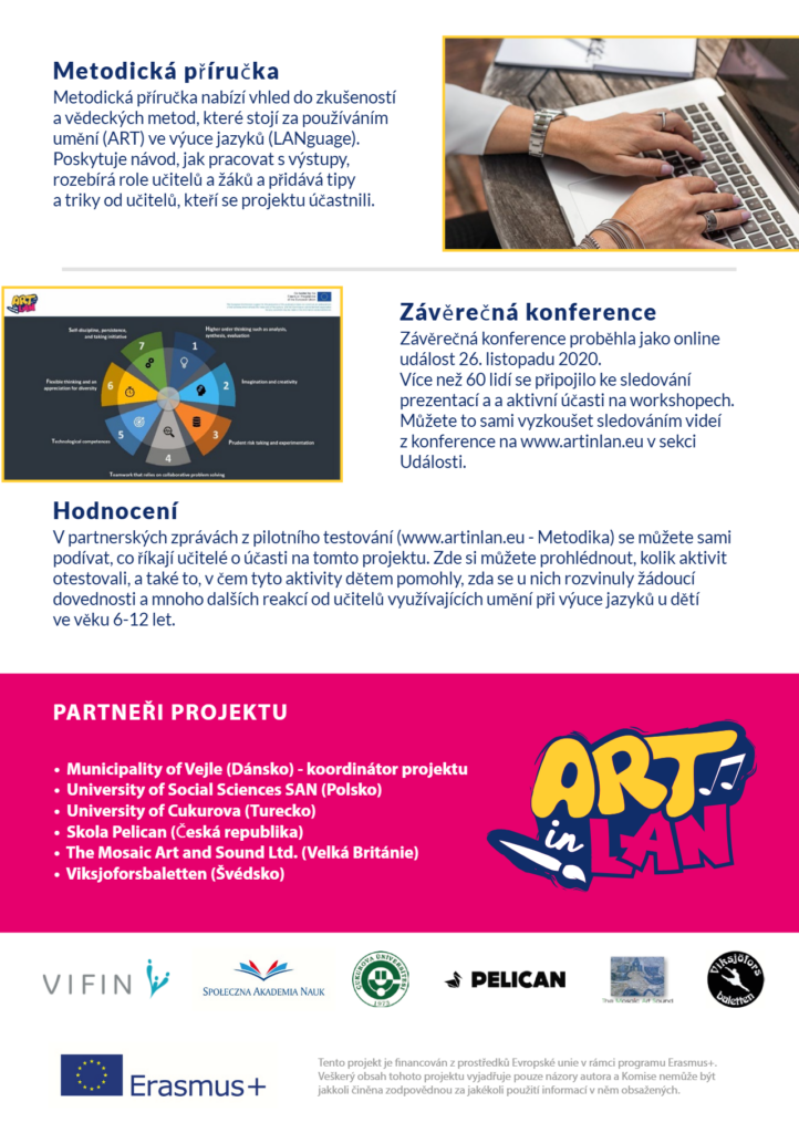- Metodická příručka pro učitele a učitelky k využívání umění ve výuce cizích jazyků. Příručka bude obsahovat i případové studie a příklady dobré praxe.