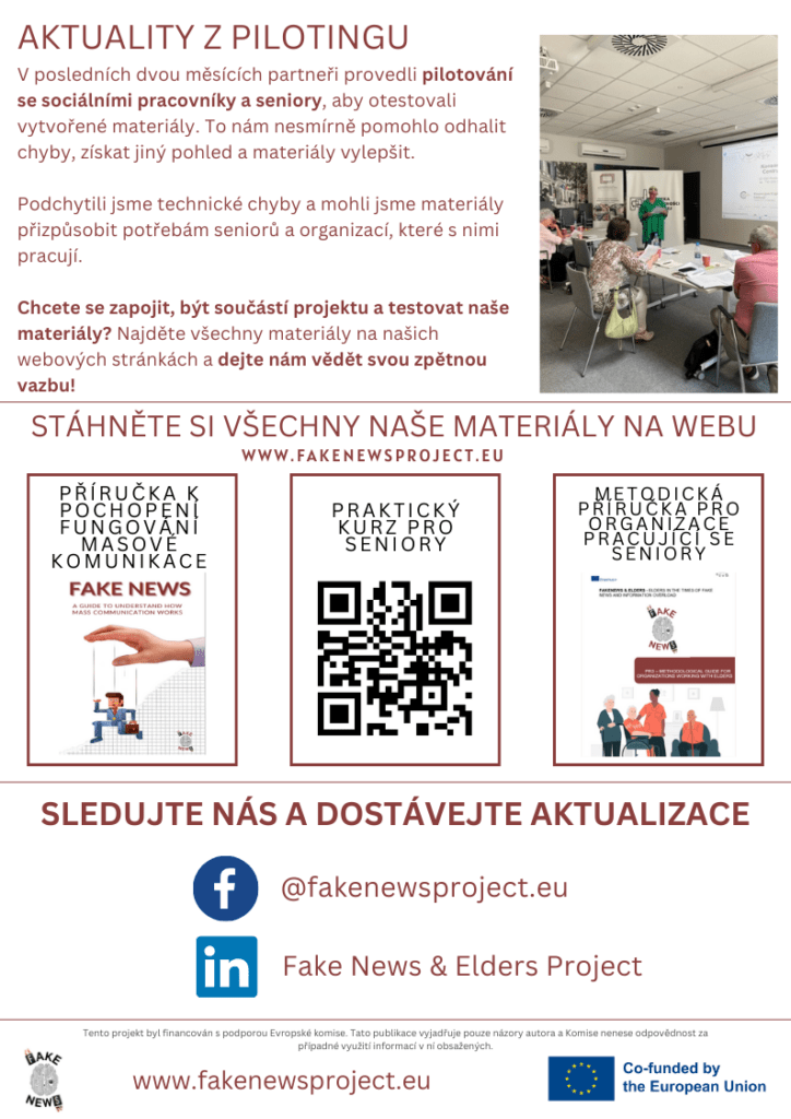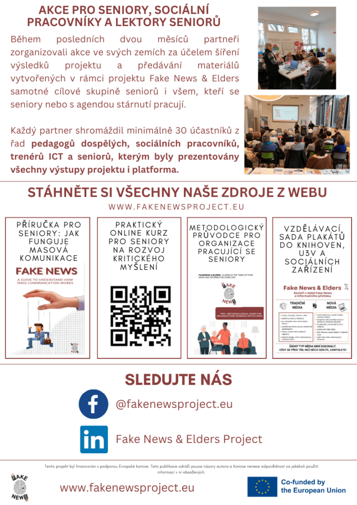 - Na tomto základě pak vznikne ryze praktický kurz pro seniory, který se zaměří na kritické používání médií ve vztahu k Fake news, mediální gramotnosti, ale také dynamice sociální sítí.